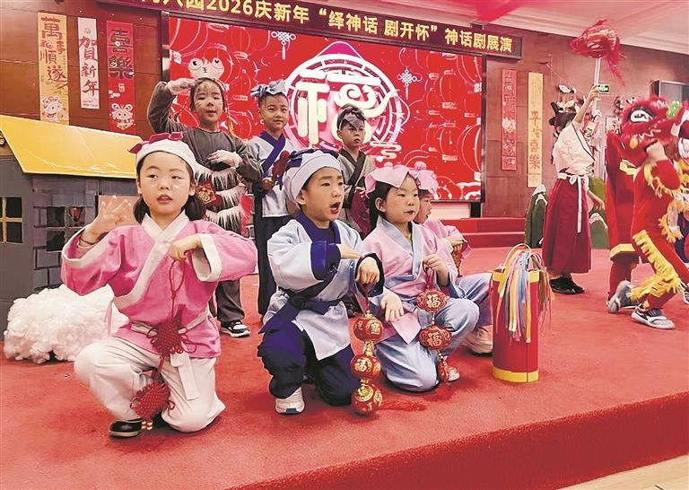 本报讯(大连新闻传媒集团记者孙卉)近日,西岗区日新街道平等社区新时代文明实践站联合西岗区第八幼儿园,以“绎神话 剧开怀”为主题开展2026庆新年神话剧展演活动,萌娃化身神话角色童趣演绎经典,为新年增添别样文化韵味。
